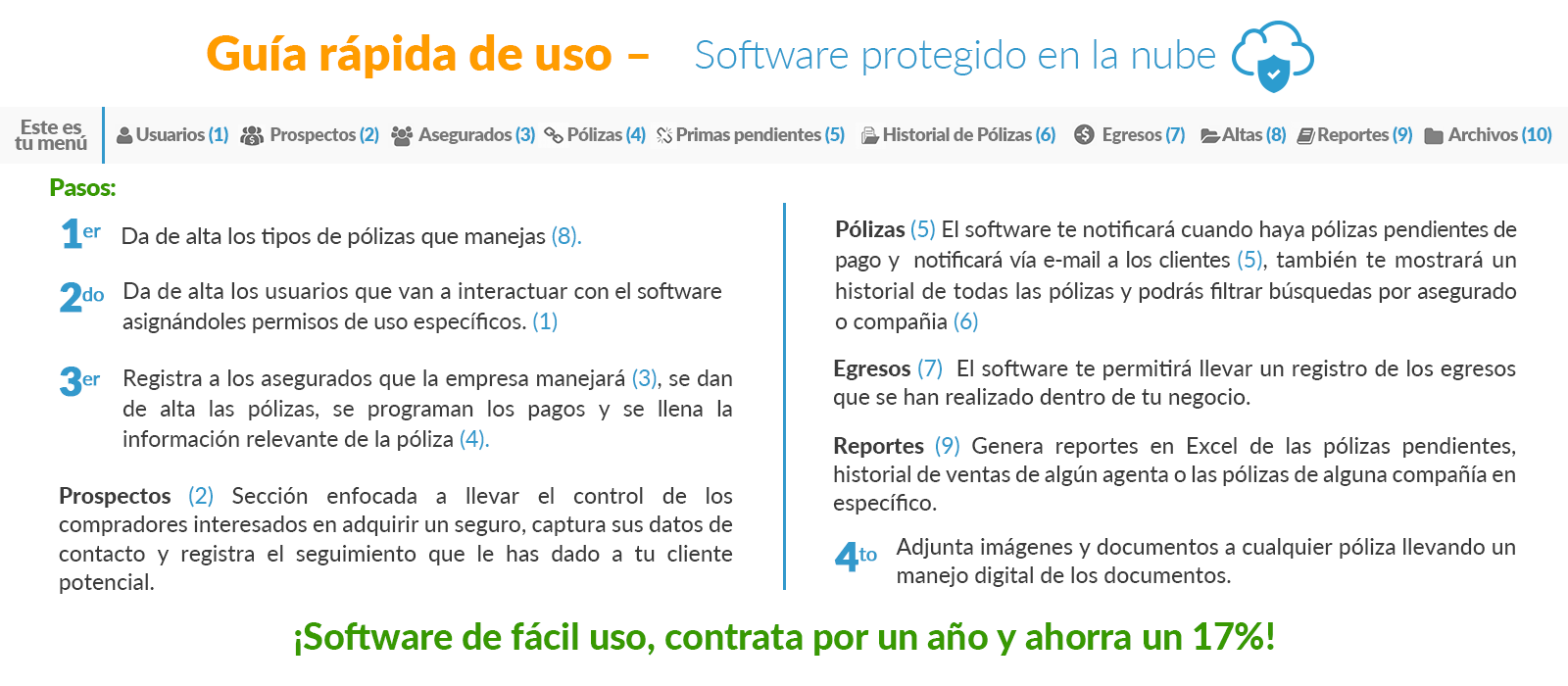 Nuestro software cumple con las necesidades que todo agente de seguros requiere; trabajando en una plataforma segura y sencilla podrás llevar el control de tu cartera de clientes en un formato digital, protegido. Con funciones como alta de pólizas, historial de pólizas, reportes y expediente de clientes, nuestro sistema te alerta oportunamente de las fechas importantes como lo son renovaciones y vencimientos. Igualmente te notificará cuando el cumpleaños de algún cliente esté cerca, pudiendo enviarle un mensaje de felicitación para fortalecer la relación agente-cliente.